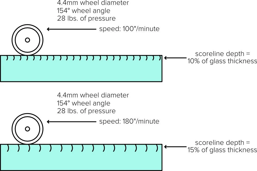 In addition to consistent pressure along the entire score line you want to apply a consistent speed to ensure a clean score that breaks easily. Sudden accelerations or decelerations can result in uneven scores. The speed at which you score basically acts the same as force; so increasing the speed of the wheel will increase the depth of the score line, which could result in glass particles appearing on your score line much the same way it does when you apply too much pressure.