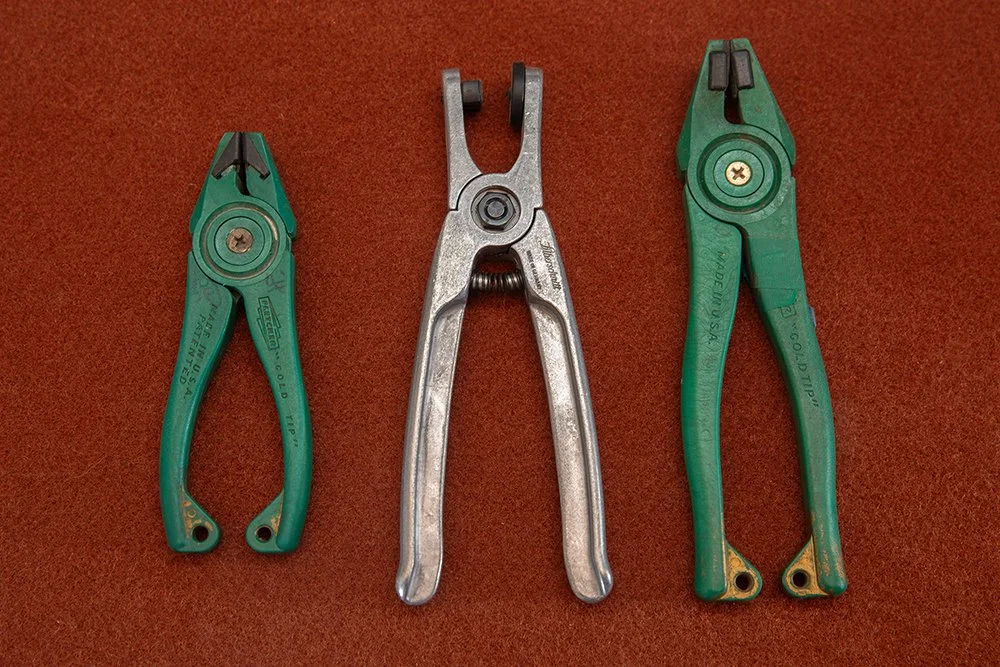 Running Pliers: These pliers have a bump in the middle on the bottom jaw and two bumps on either edge of the top jaw, and work by applying even pressure to run the score line. There are also speciality running pliers like the Silberschnitt running pliers that are nice to have but are definitely not a necessity. They have a bump on the center of the bottom jaw and a rotating pad on the top jaw that are great for curves and thin strip.
